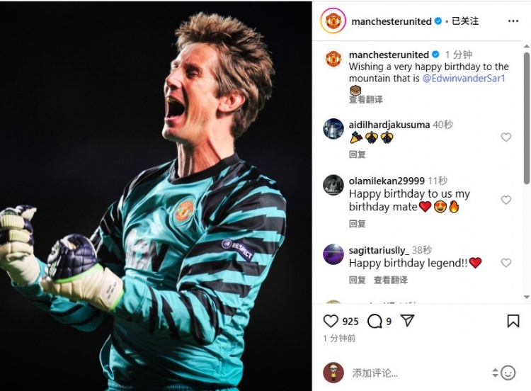 曼联官方Instagram写说念:“祝门前的那座大山——范德萨生辰倨傲!”