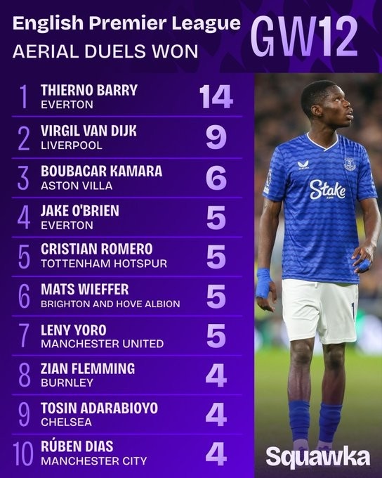 数据统计暴露,巴里在本场比赛以为完成了14次顺利争顶,这亦然本赛季英超单场最多。算作对比,本轮英超联赛顺利争顶第二多的范戴克也仅有9次。