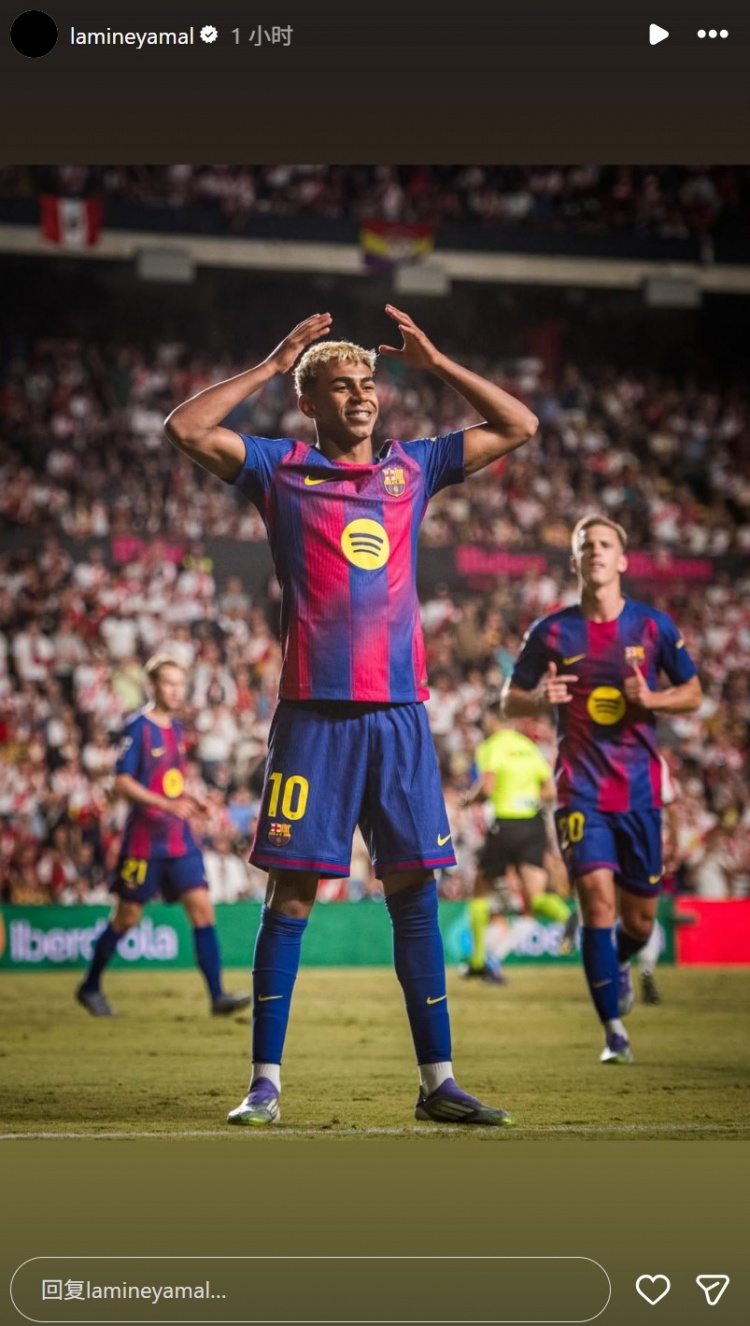 本场比赛亚马尔造点并打进点球,球员在社媒晒出我方“戴金冠”庆祝进球算作。