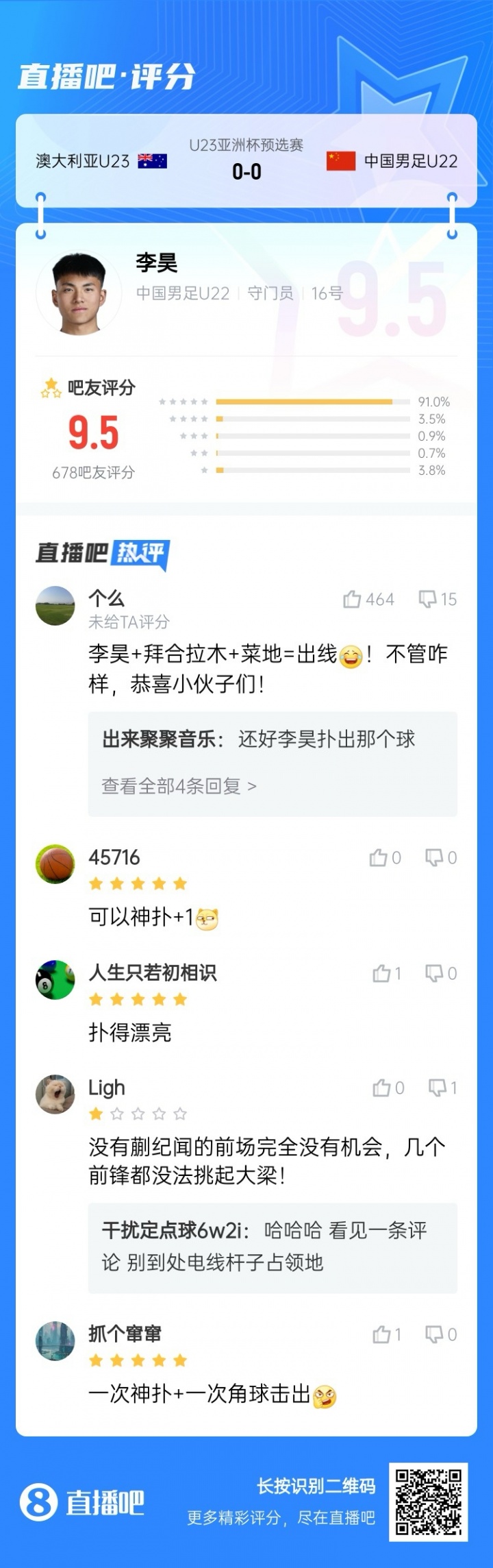本场比赛,门将李昊推崇出色,其中孝敬了最要道的一次神扑,力保球门不失,匡助球队逼平敌手。