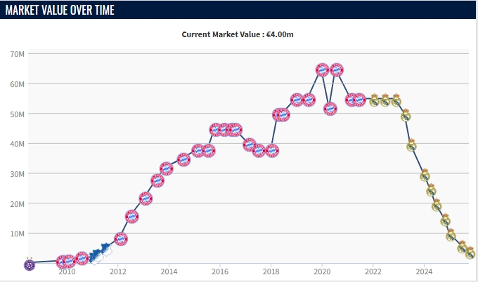 2021年夏窗阿拉巴与拜仁协议到期,随后解放身加盟皇马,29岁的他在皇马也夺得了不少冠军。30岁时阿拉巴身价尚有5500万欧,但受伤病影响,只是3年便降到只剩400万欧,跌回了领先能干霍村之时的身价。