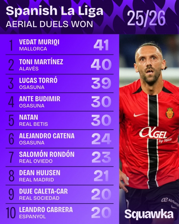 10月7日讯 日前,Squawka统计了本赛季西甲争顶收效次数排名,赫伊森21次位居第八。