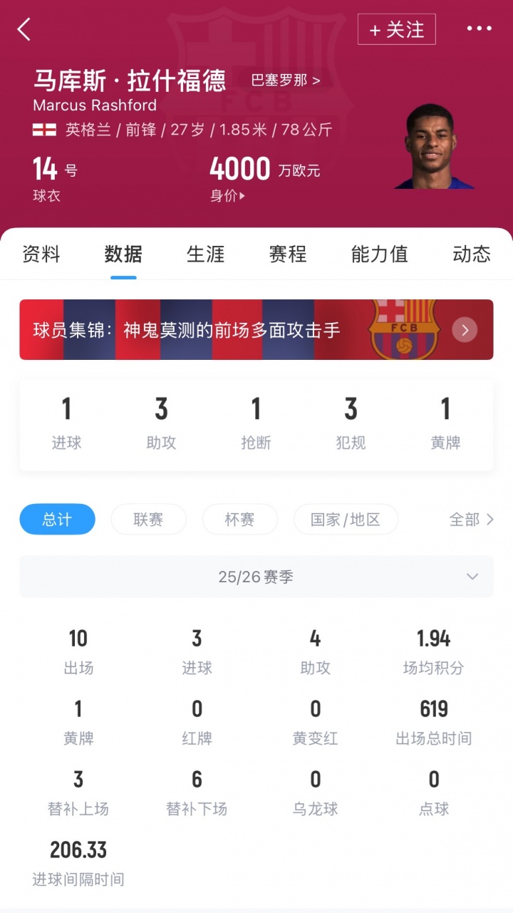 27岁的拉什福德本赛季也曾代表巴萨出场10次,孝敬3球4助,当今德回身价4000万欧元。