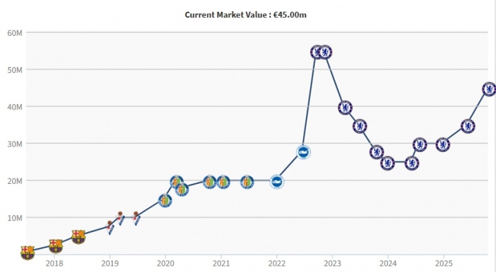 10月18日讯 昨日德转更新英超各队球员身价,其中,切尔西左后卫库库雷利亚身价上升1000万欧,来到4500万欧。