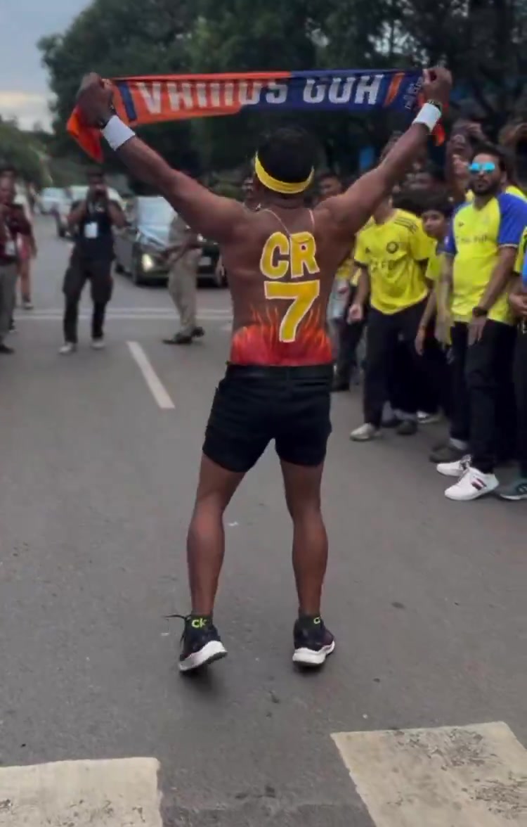 尽管C罗莫得随利雅得得手来到客场,但印度球迷对这场比赛仍然充满祥和,有印度球迷在街头师法C罗的标记性庆祝SIU,他的胸前写有“果阿”,背后则是彩绘的“CR7”字样。