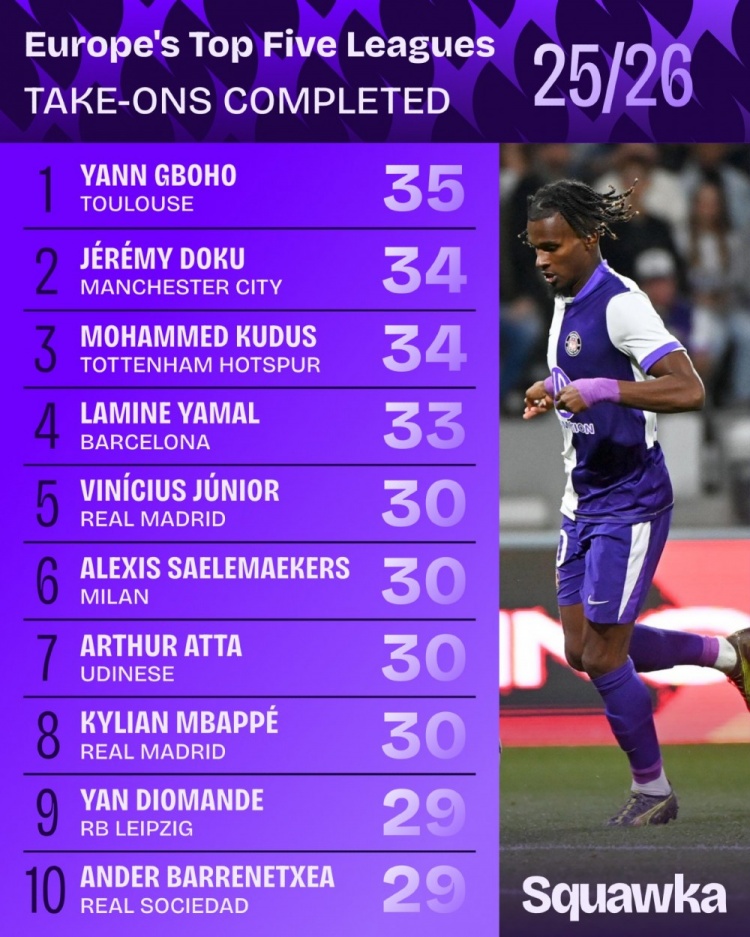 11月21日讯 五大联赛战火行将重燃,数据机构squakwa也统计了本赛季于今的五大联赛球员见效过东谈主次数情况,图卢兹新星扬·博霍居首。