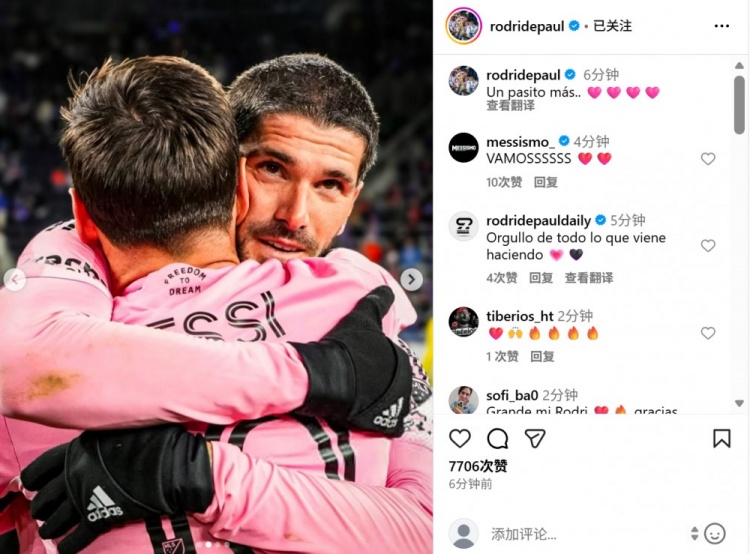 本场比赛梅西孝敬1球3助攻,德保罗也在社媒晒出与梅西拥抱合影,配文:“再进一步🩷🩷🩷🩷”