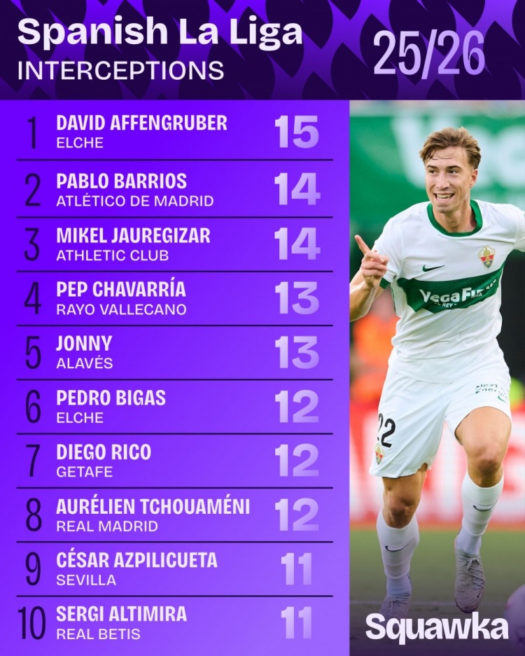 10月7日讯 日前,Squawka统计了本赛季西甲禁绝次数排名,巴里奥斯14次并排第2,琼阿梅尼12次并排第6。