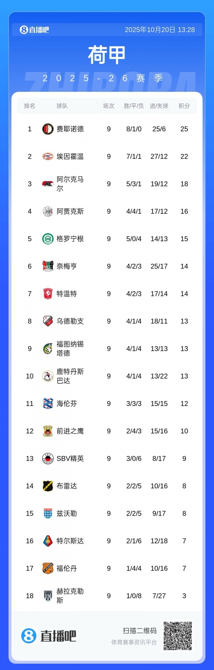 荷甲9轮事后,范佩西挂帅的费耶诺德8胜1平不败,进25球丢6球,积25分领跑荷甲。