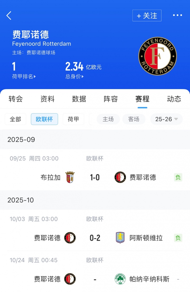 而在欧联赛场,费耶诺德际遇了两连败,0-1输给葡超布拉加,0-2不敌阿斯顿维拉。欧战开局2场0进球,亦然费耶诺德队史最差记录。