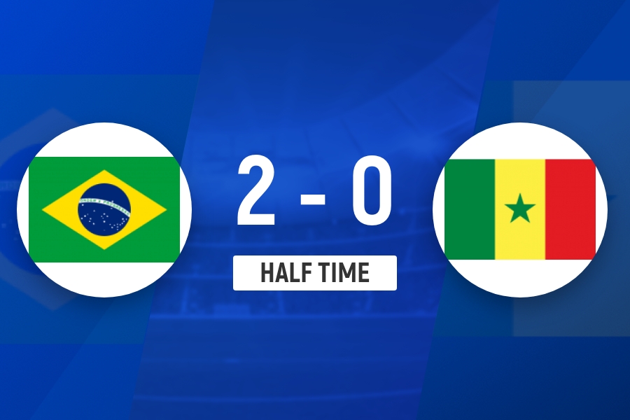 上半场补时2分钟,半场扫尾,巴西2-0塞内加尔。