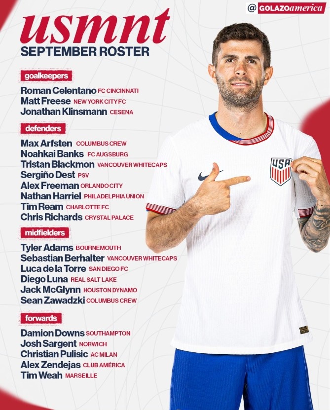 8月27日讯 行将到来的海外比赛日,好意思国将会和韩国及日本交手。当今,好意思国队照旧公布了本期国度队大名单,普利西奇领衔,蒂莫西-维阿、德斯特入选。