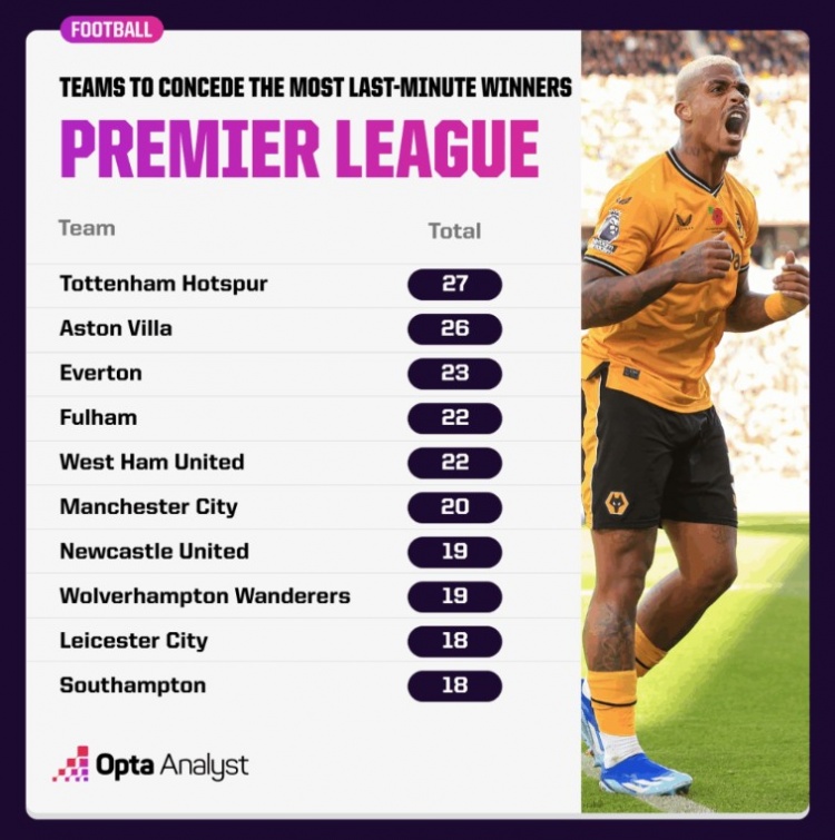 8月27日讯 在英超历史上,有一些球队世俗会成为临了一分钟被绝杀的布景板。OPTA盘货了英超历史临了一分钟被绝杀次数最多球队top10,热刺27次居首。