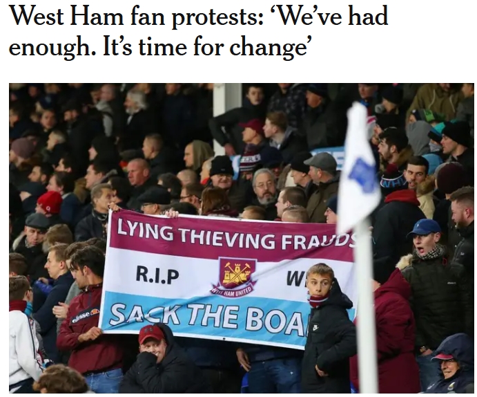 2016年从厄普顿公园球场搬迁至伦敦率领场、对董事会处理俱乐部方法的不悦,以及相关票价的争议,皆是激发球迷震怒心思的部分原因。