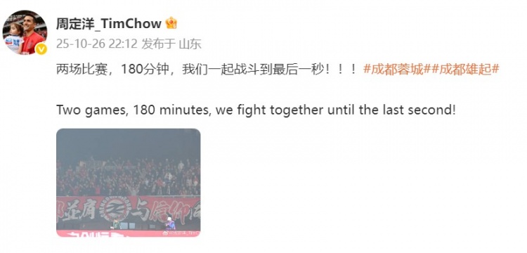赛后,蓉城球员周定洋在个东说念主微博中写说念:两场比赛,180分钟,咱们一齐战役到临了一秒!!!