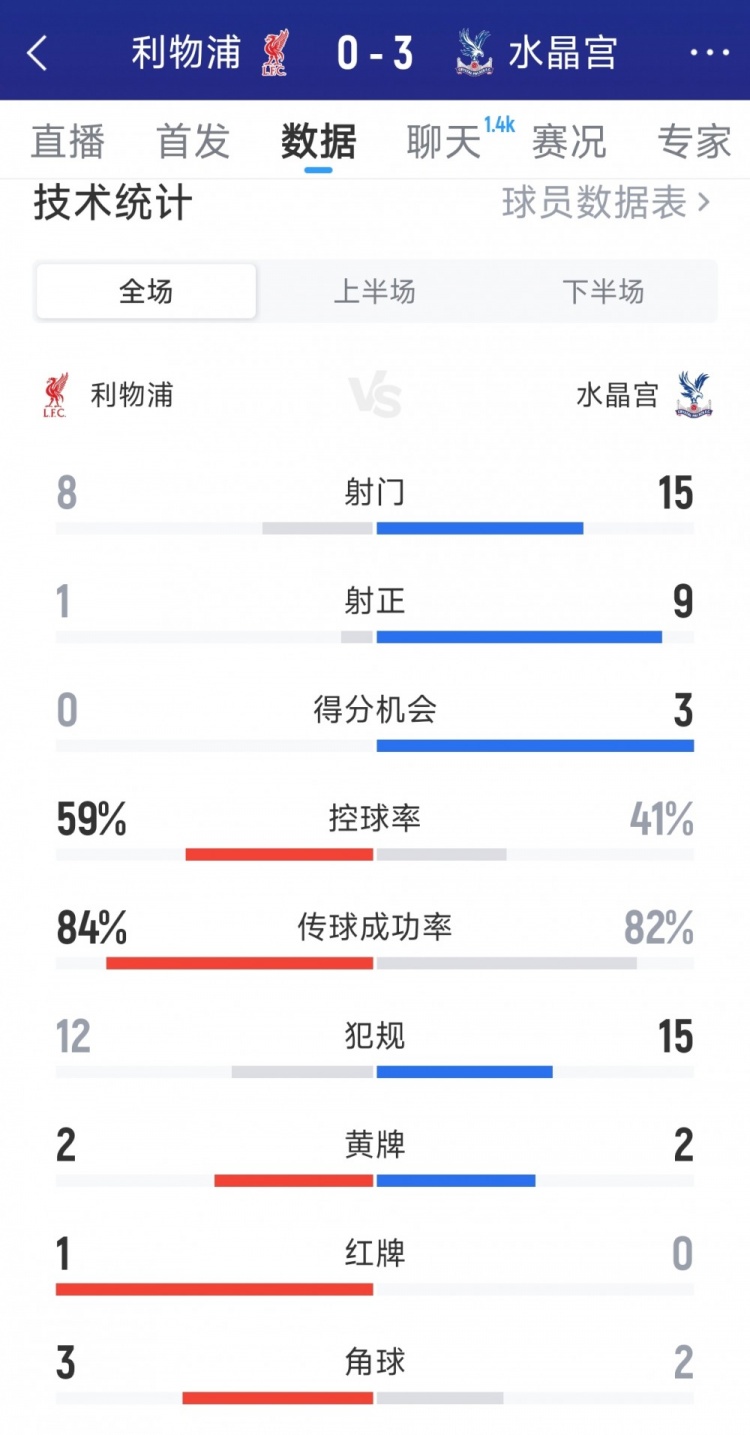 10月30日讯 在本轮联赛杯,利物浦0-3完败供水晶宫,以下为两边全场数据对比: