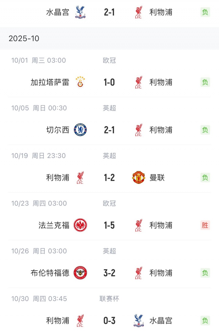 利物浦各赛事两连败,近7场1胜6负,他们下场将于11月2号迎战维拉。