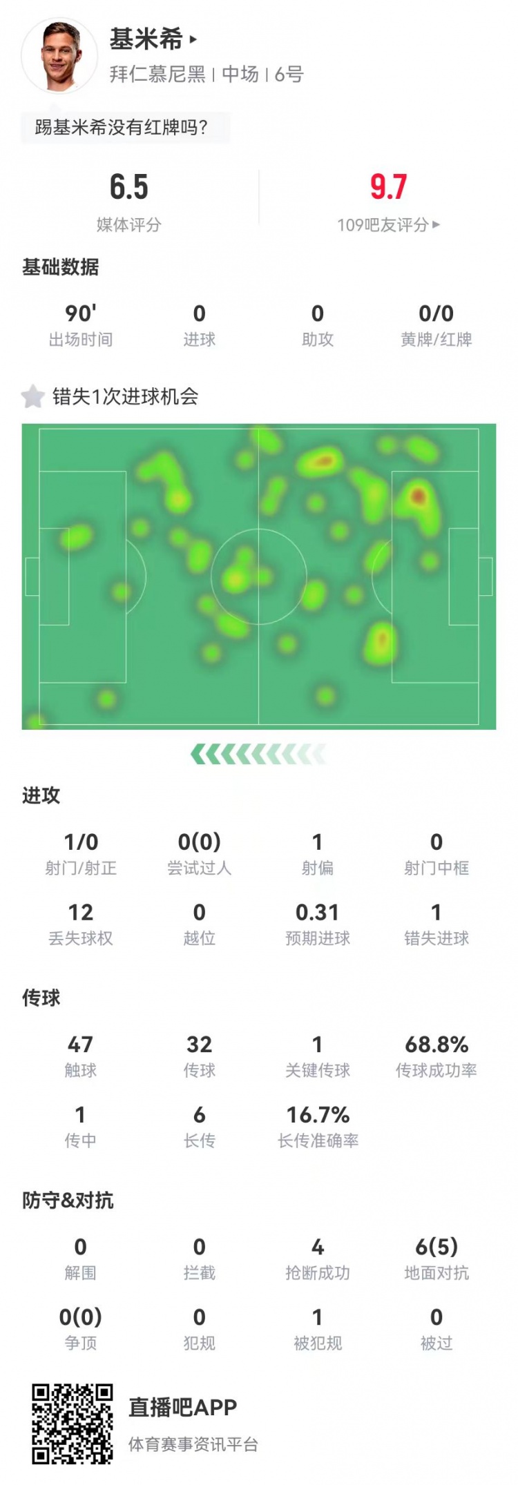 11月5日讯 拜仁在本轮欧冠焦点战2-1力克巴黎,基米希本场数据如下: