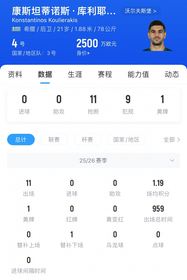 库利耶拉斯基现年21岁,是别称左脚中卫,他客岁夏天加盟沃尔夫斯堡,本赛季已为球队出场11次,现身价2500万欧。