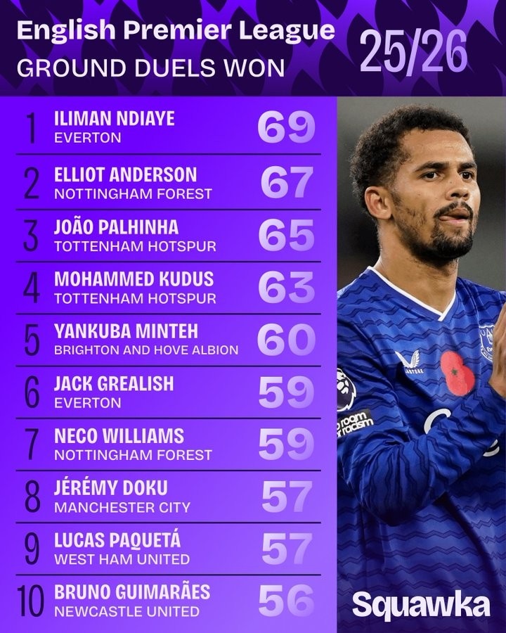 1.伊利曼·恩迪亚耶,埃弗顿,69次