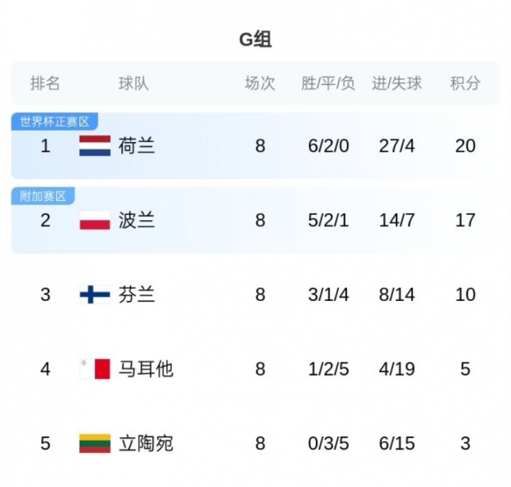 G组除了荷兰头名晋级,第二名波兰插足附加赛。