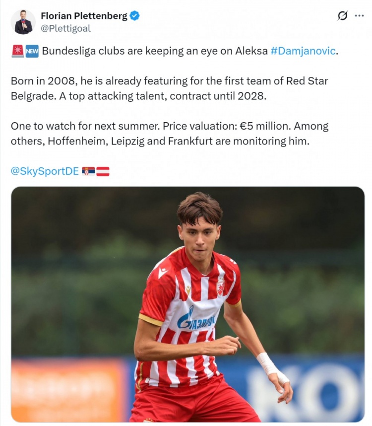 普莱滕伯格指出,16岁前卫达姆贾诺维奇仍是为红星一线队出场,他与俱乐部的协议2028年到期。这位小将明夏的动向值得关心,球员估价500万欧元,霍芬海姆、莱比锡、法兰克福等俱乐部王人在关心球员。