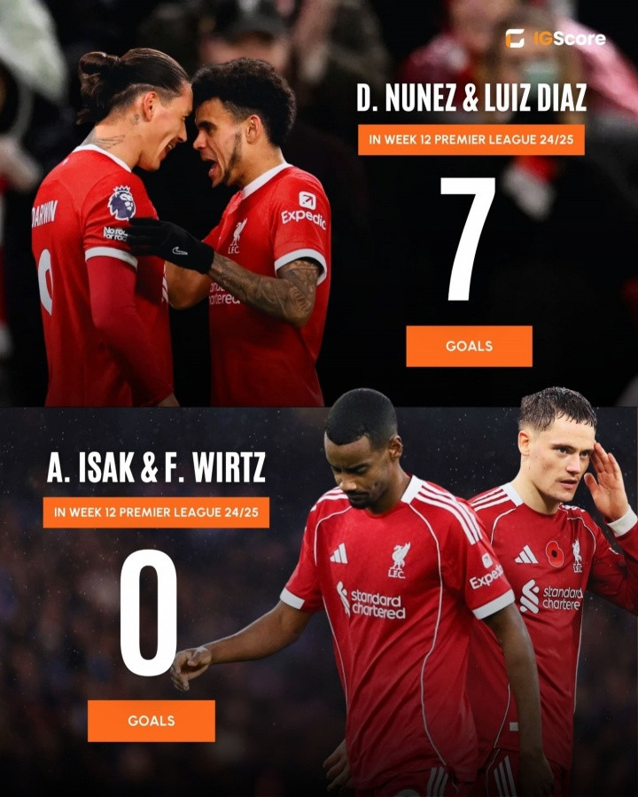 本年夏窗利物浦耗尽1.45亿欧元+1.25亿欧元签下两大新援伊萨克和维尔茨,但12轮英超事后,两东说念主颗粒未收,独一伊萨克在联赛杯中打进一球。
