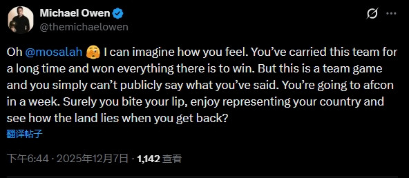 直播吧12月07日讯迈克尔欧文发社媒谈萨拉赫的言论。英超第15轮,利物浦客场3-3被绝平,萨拉赫全程替补,赛后采访引爆全网。