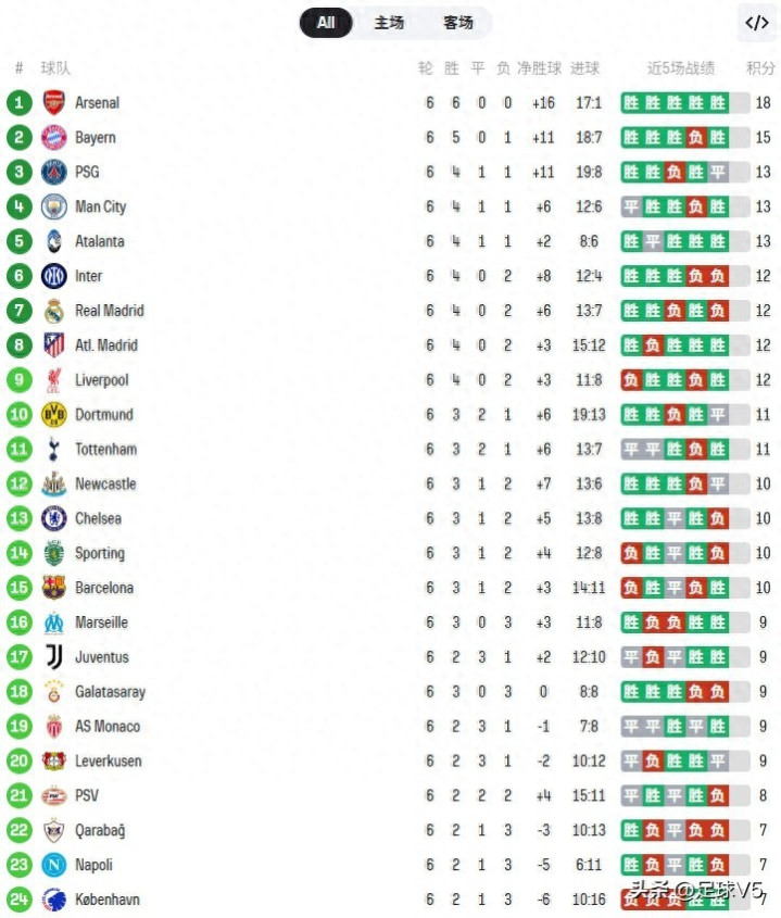 欧冠联赛阶段第六轮一起战罢,积分榜所在果决晴朗。阿森纳成为本赛季欧冠唯独保合手全胜的球队,6场比赛打进17球仅失1球的惊东说念主数据,让枪手基本锁定了一个纵贯16强的席位。