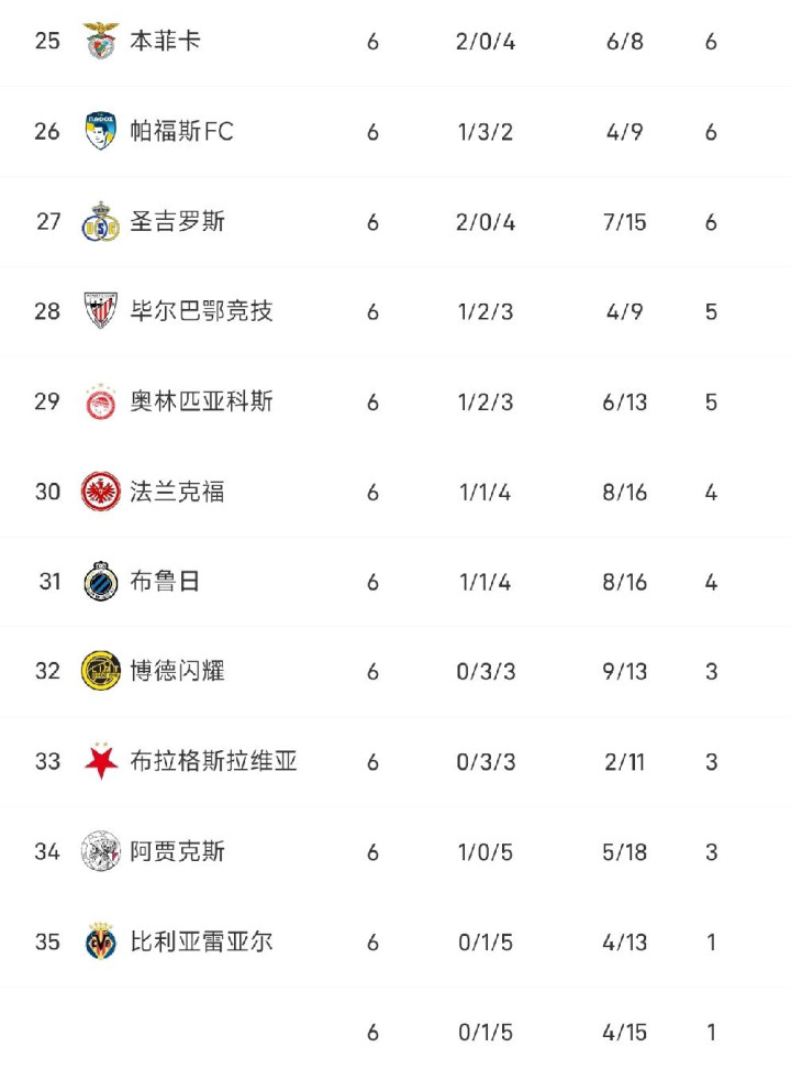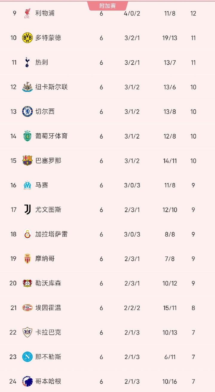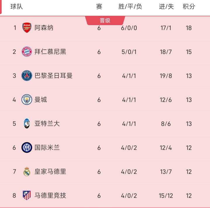 当今欧冠积分榜整身段局明晰,阿森纳以18分遥遥卓越,拜仁慕尼黑过期3分位列第二,巴黎、曼城、亚特兰大同积13分,递次排在第三至第五位,皇马、利物浦等传统权门则以12分位列第六至第九位,后续赛事的竞争依旧充满悬念 。