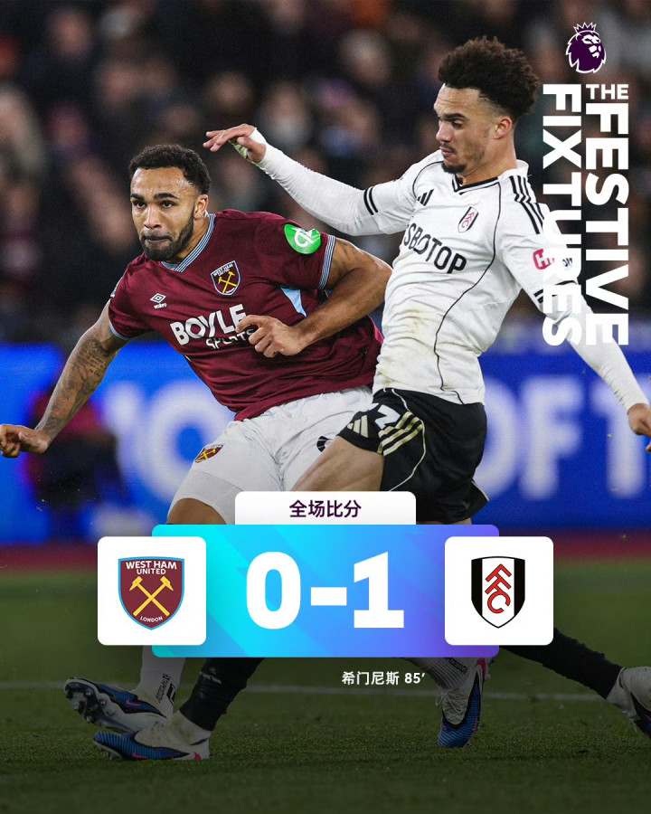 第85分钟,斯卡莱斯突围诞妄,希门尼斯收拢契机头球破门,富勒姆1-0突破僵局。最终,富勒姆凭借这粒绝杀进球,客场1-0打败西汉姆联。