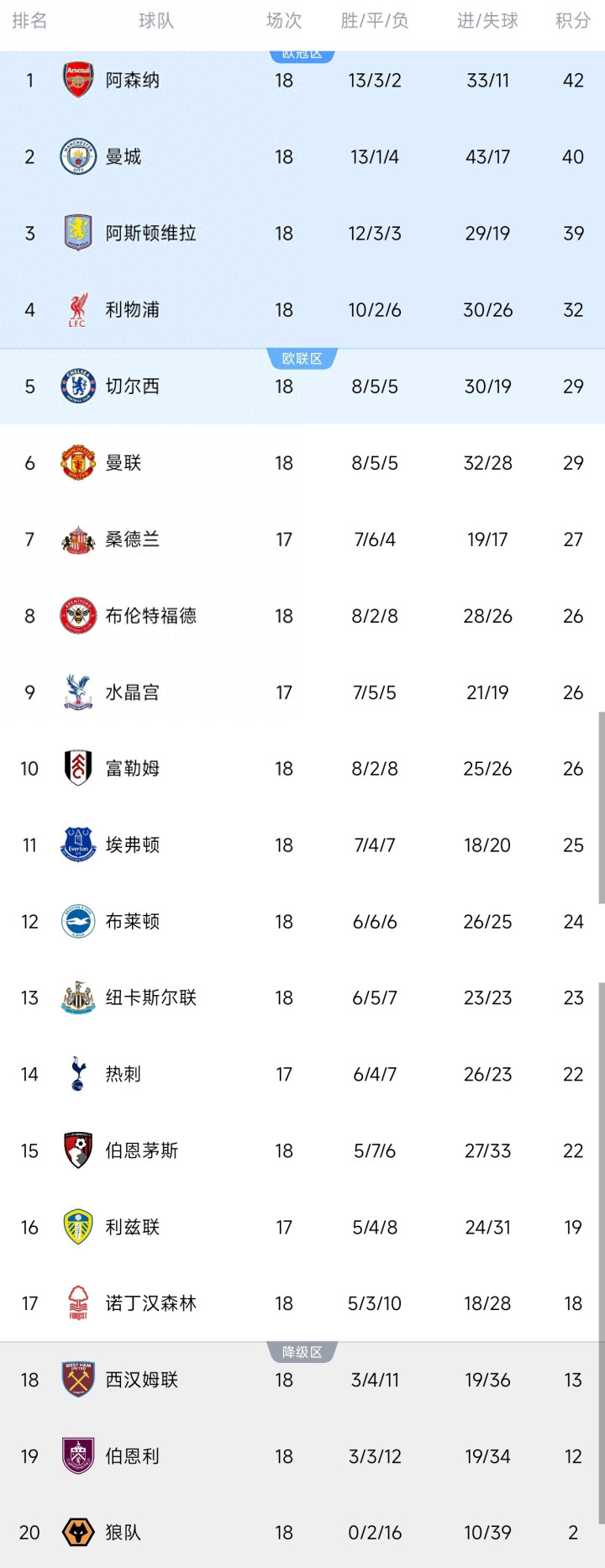 阿森纳2-1打败布莱顿后以42分不竭领跑,曼城客场2-1力克诺丁汉丛林积40分领路前二位置。利物浦积32分来到积分榜第4参加欧冠区,切尔西因客场1-2不敌阿斯顿维拉,与曼联同积29分名次分列第五和第六,阿斯顿维拉保持第三。