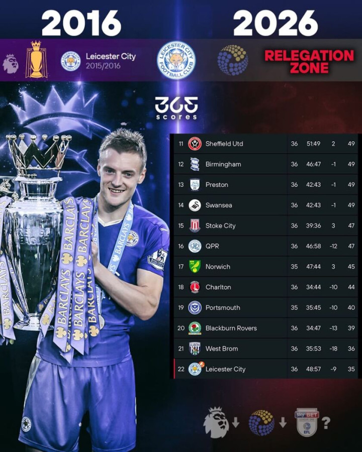 2016年,莱斯特城以5000赔1的逆天赔率登顶英超,写下了世界足坛近代史上最震撼的草根童话。10年后的2026年,这支曾站上英格兰之巅、闯入欧冠八强、捧起足总杯第一名 的传奇球队,正站在队史最黑暗的悬崖边——他们不仅在三年内两次从英超降级,更在英冠赛场深陷保级泥潭,距离跌入英格兰第三级别职业联赛 ,只剩最后6场赛事 的距离。