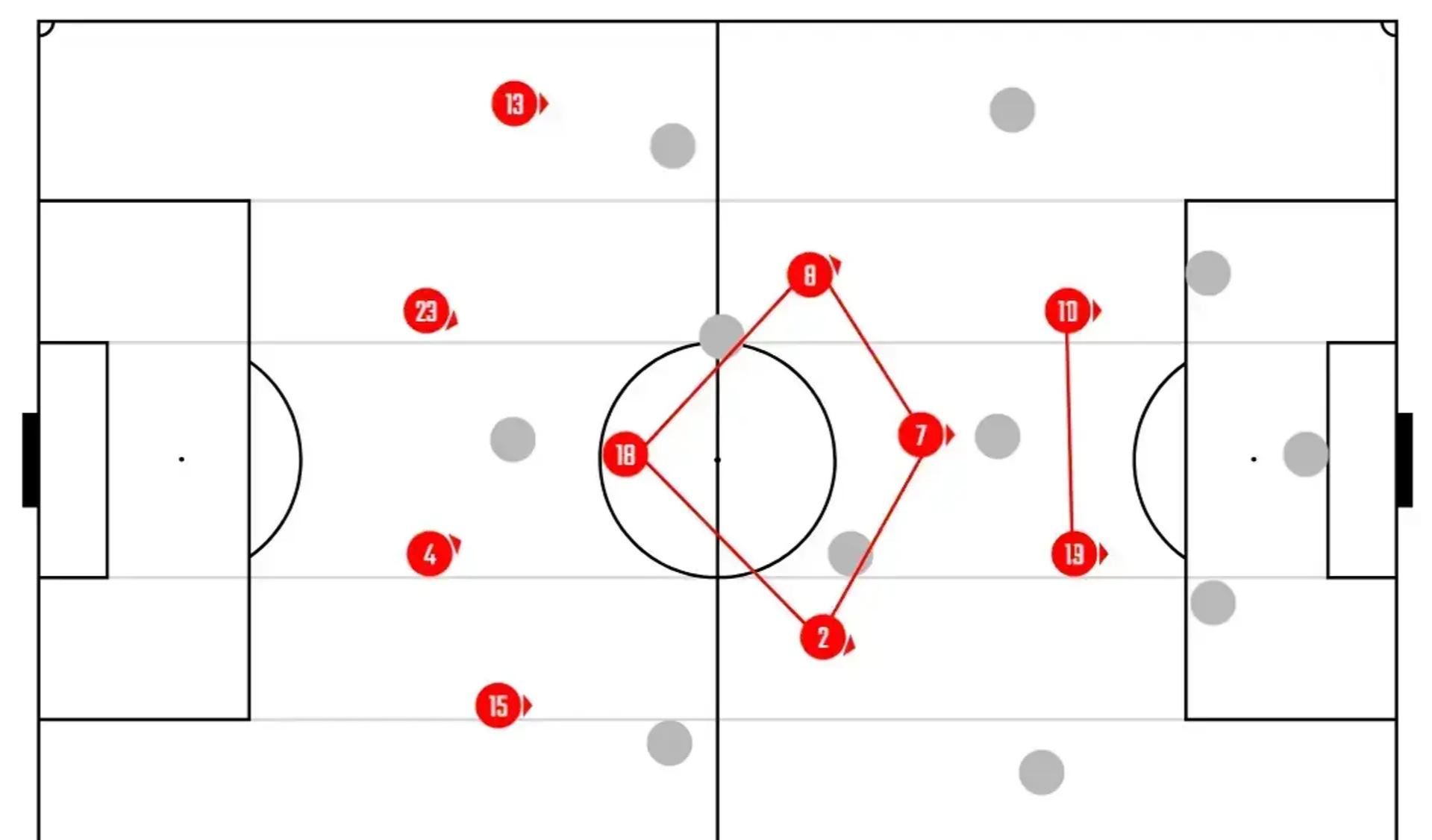 他灭亡惯例菱形中场压迫,将B费顶前酿成四东说念主前场压迫组,屡次制造有用逼抢阵势。