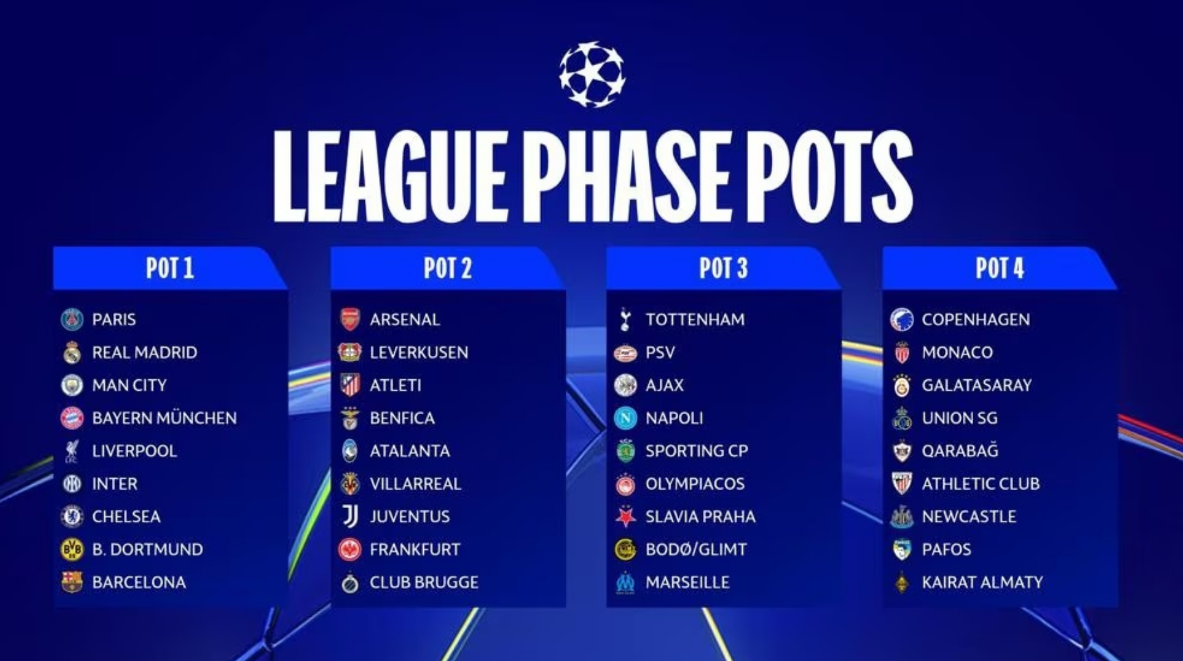 由于一档有曼城、利物浦、切尔西3支英超球队,总共一档非英超球队极有可能碰2支英超队!二档阿森纳、三档热刺、四档纽卡仅能与非一档英超队配对。由于英超6队参赛,但抽签规则致其内讧减少、外战强度飙升,一档三强能否扛住“会剿”成焦点。