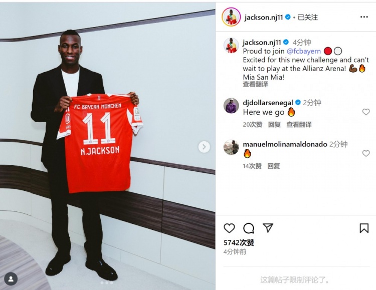 杰克逊晒起始拿拜仁11号球衣的相片,并写谈:“很自爱能加盟拜仁,对这个新挑战感到振奋,迫不足待念念要在安联球场踢球了!Mia San Mia!!”
