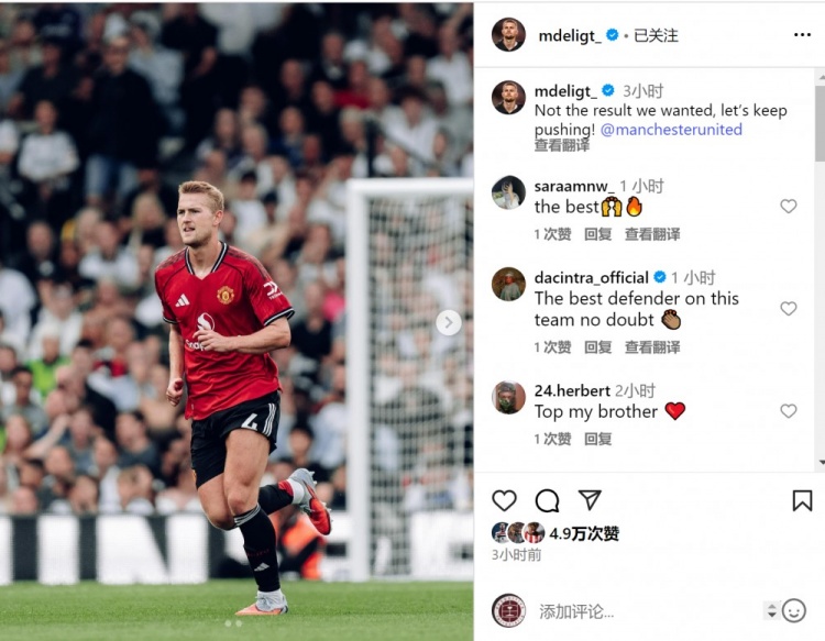 德里赫特此役为曼联踢满全场,赛后他在酬酢媒体上写谈:“这不是咱们念念要的效果,让咱们接续勉力!”