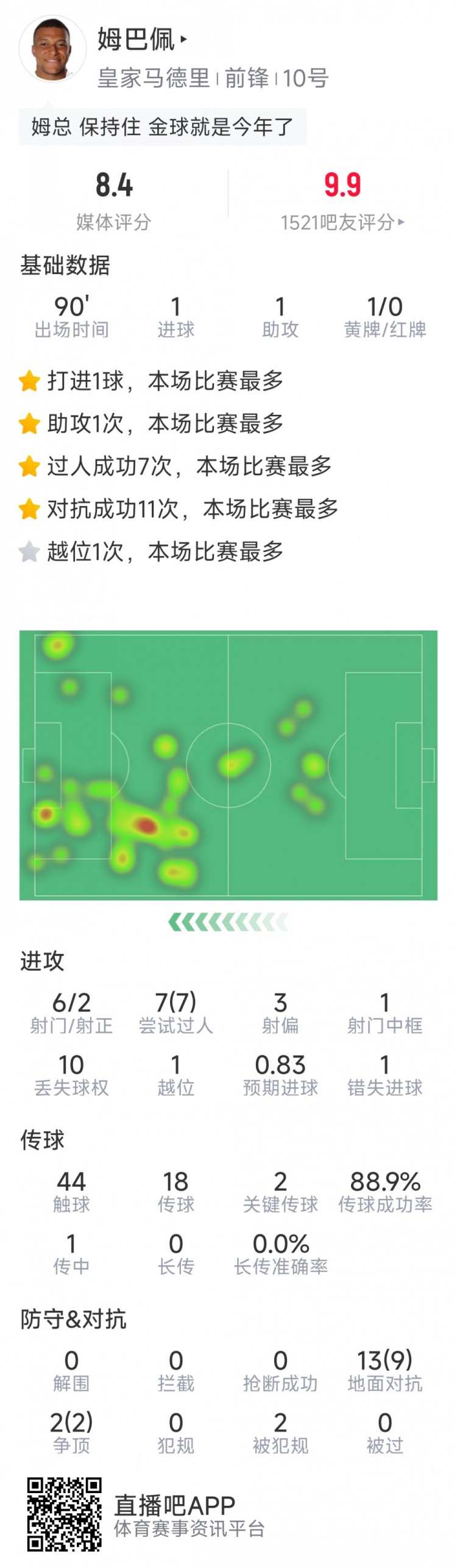 9月14日讯 在本轮西甲,皇马2-1打败皇家社会。姆巴佩传射立功,以下为他在本场数据: