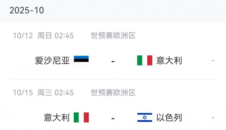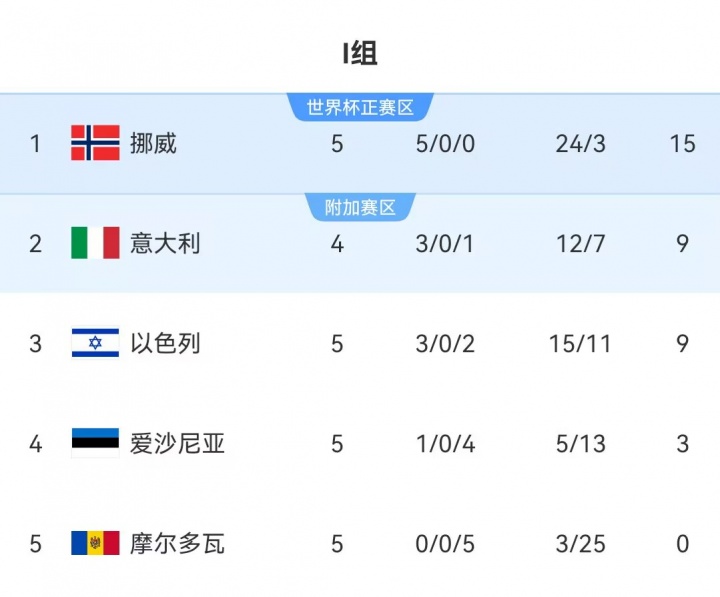 意大利现在的世初赛出线形态并不乐不雅:他们少赛一场逾期小组名依次1的挪威6分。10月12日,他们将客场挑战爱沙尼亚;10月15日,他们将主场迎战以色列。