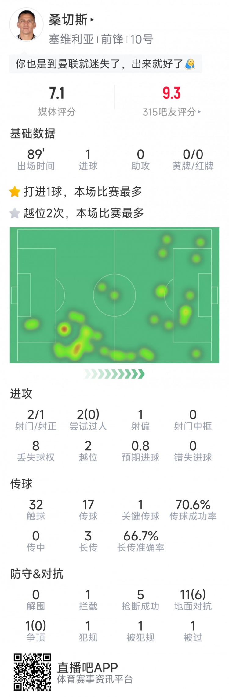 10月6日讯 在本轮西甲,塞维利亚4-1打败巴萨。本场比赛桑切斯濒临旧主破门,以下为他在本场数据: