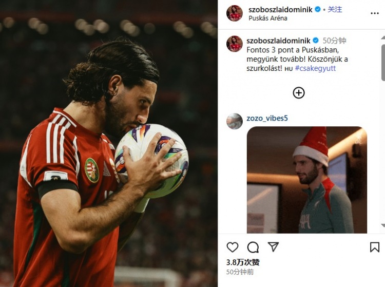 10月13日讯 匈牙利辞世初赛2-0打败亚好意思尼亚,匈牙利中场索博斯洛伊在球队取胜后更新了个东谈主外交媒体,并发布了一张我方亲吻比赛用球的像片。