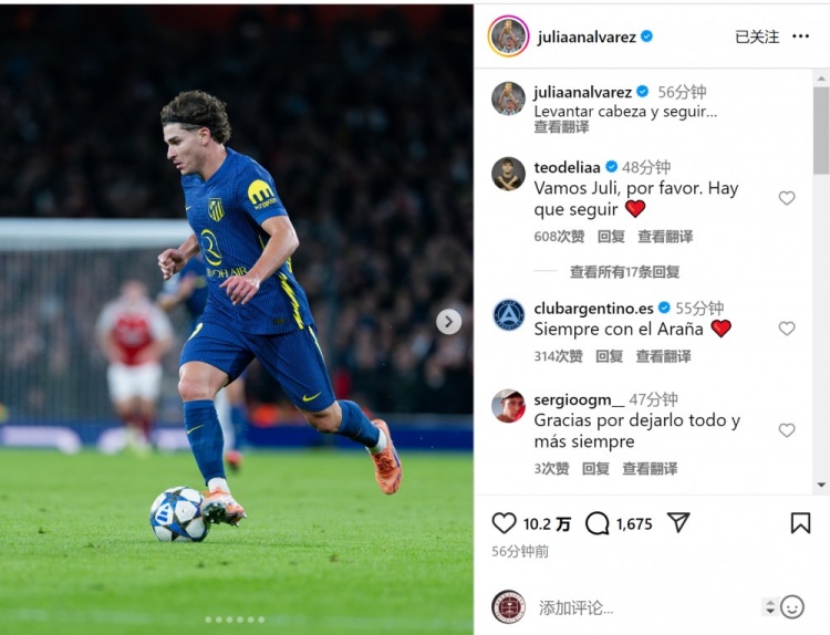 马竞时尚阿尔瓦雷斯此役踢满全场,赛后他在酬酢媒体上晒出比赛像片,配文:“抬脱手,陆续前进。”
