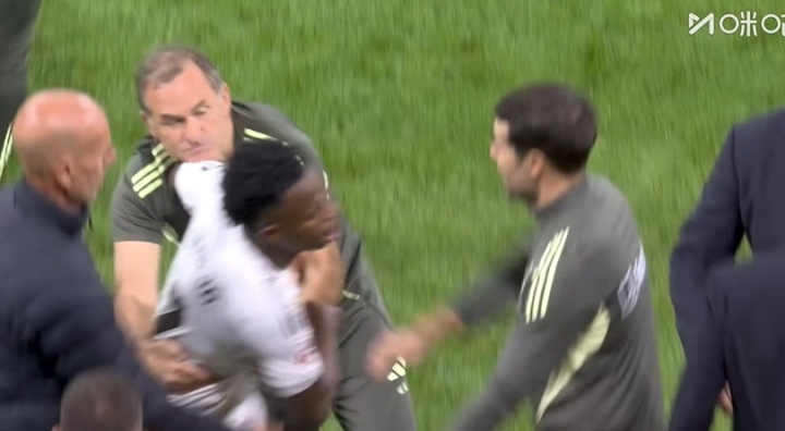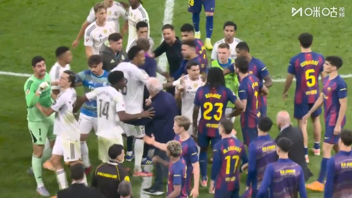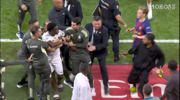 10月27日讯 国度德比赛后爆发第二次残害,两队混战!维尼修斯冲亚马尔贯穿作念“闭嘴”手势,念念动粗职责主谈主员死命拉住!