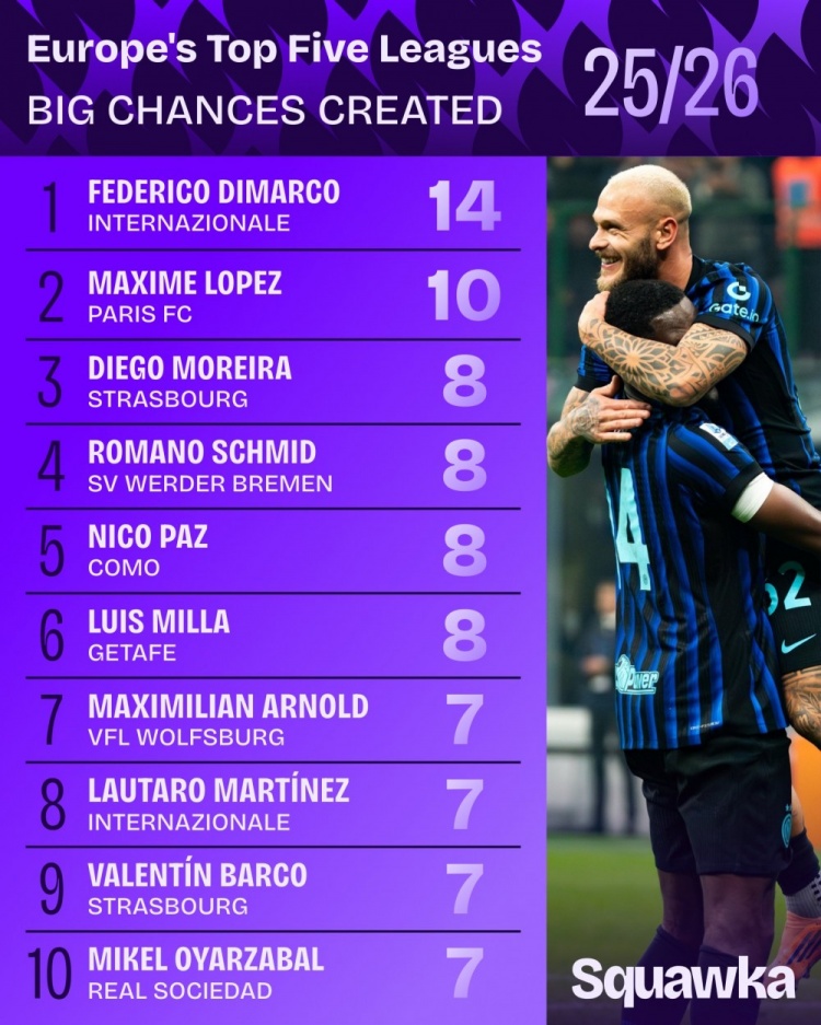 11月21日讯 Squawka统计了本赛季球员在五大联赛创造紧要契机的次数,比肩出榜单,迪马尔科创造14次紧要契机最多。