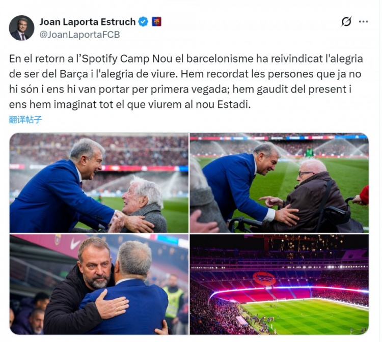 巴萨俱乐部主席拉波尔塔在酬酢媒体上写说念:“在重返坎普诺的这一天,巴萨球迷们再行找回了身为巴萨东说念主的兴奋与怡悦。”