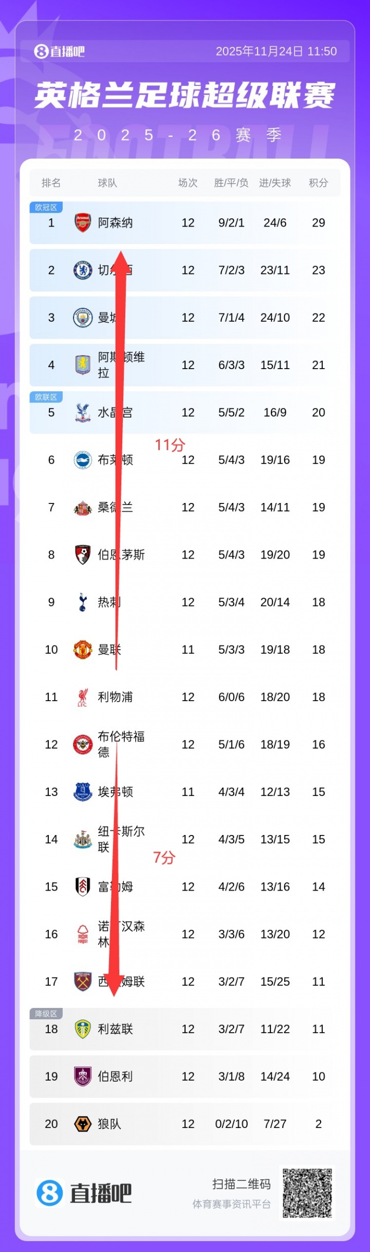 11月24日讯 英超第12轮大部分比赛齐已限制,曾一度5分领跑英超积分榜的利物浦本轮又吃到败仗,排行依然掉到了第11位。