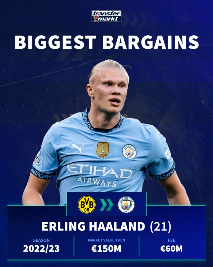 哈兰德(多特→曼城):那时身价1.5亿欧,转会费6000万欧