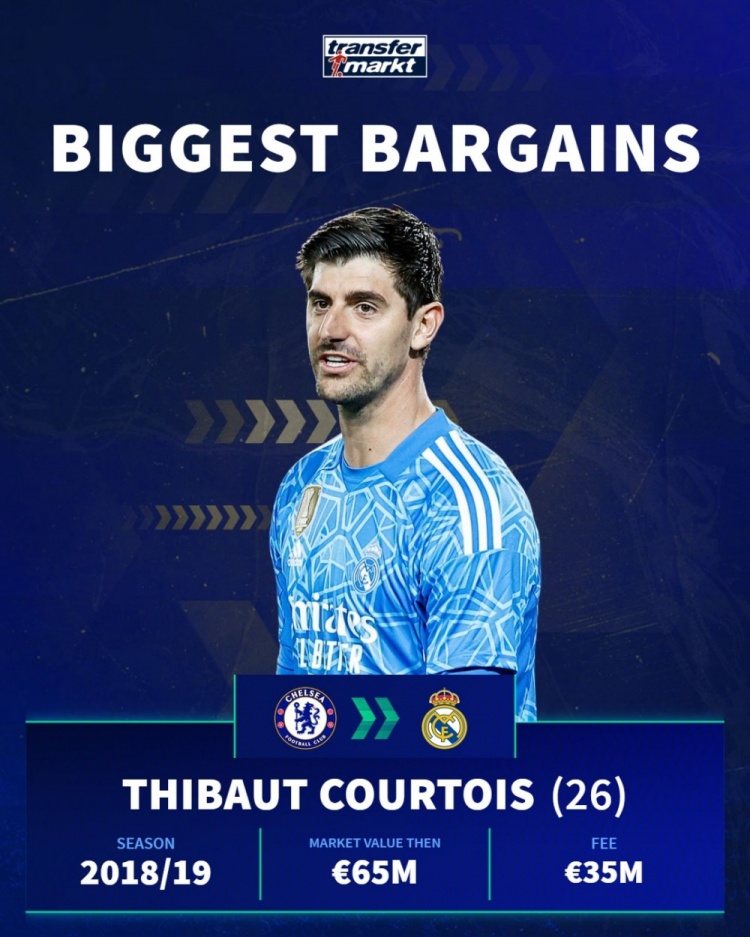 库尔图瓦(切尔西→皇马):那时身价6500万欧,转会费3500万欧