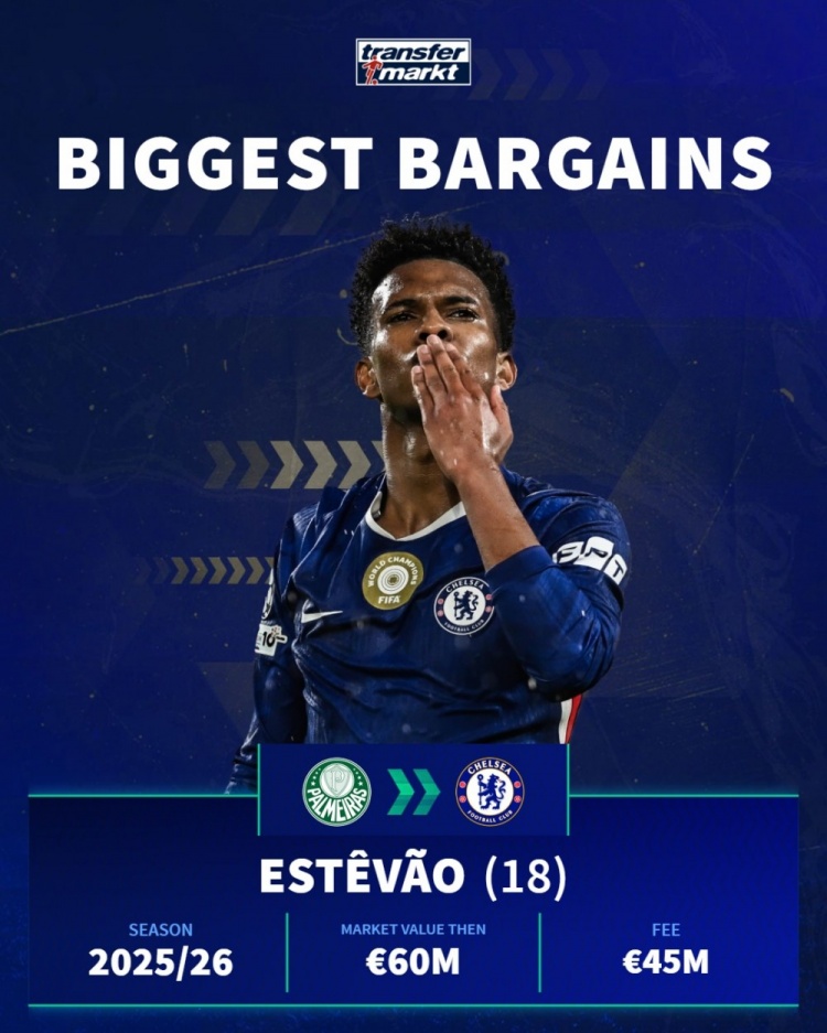 埃斯特旺(帕尔梅拉斯→切尔西):那时身价6000万欧,转会费4500万欧
