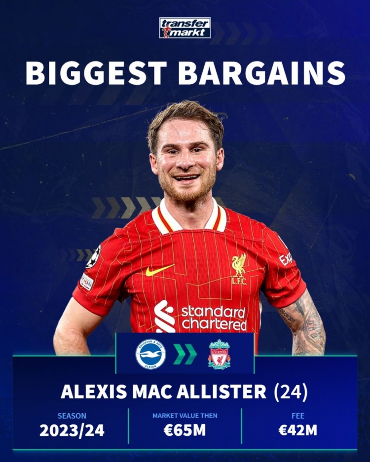 麦卡利斯特(布莱顿→利物浦):那时身价6500万欧,转会费4200万欧